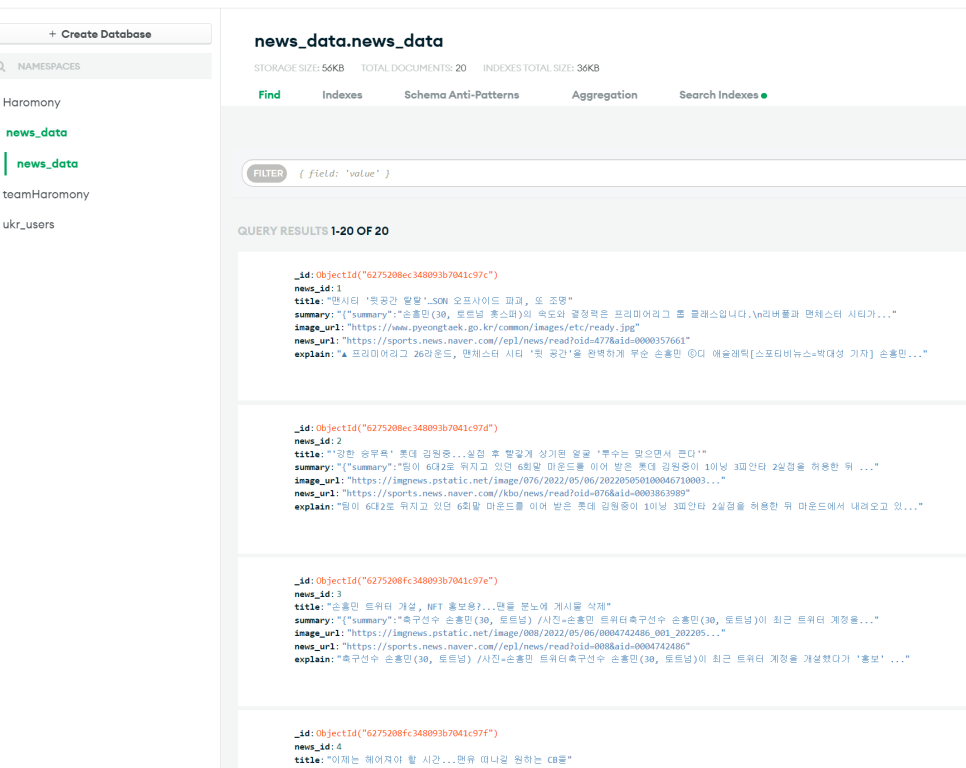 위와 같은 에러들을 이겨내고 최종 적으로 뉴스 관련된 정보들을 관리하는 DB까지 구축했다. 아주 완벽해
