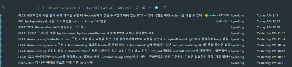 : 어제 하루종일 고민해서 만든 스프링 구조를 처음부터 천천히 기능 하나씩 커밋하면서 문서화 하고 있다. 커밋 메세지를 정리하면서 개발하는 것 만으로도 확실히 복습의 효과가 있는 것 같다. 조금씩 익숙해지는 느낌이어서 너무 기분이 좋다.