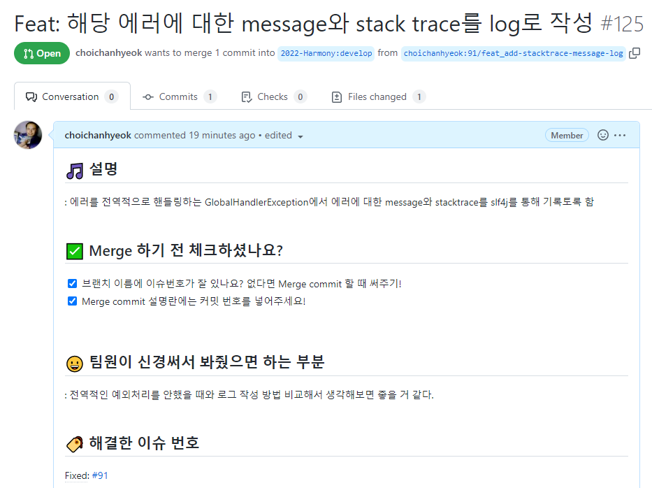 이슈, PR 과정에서 발생하는 불필요한 비용을 "템플릿"이라는 도구를 이용해 해결해 너무 기분이 좋다. 또 첫 로깅을 기존 프로젝트에 부담이 안되는 선에서 나름대로 잘 해결한 거 같아 더 기분이 좋다!