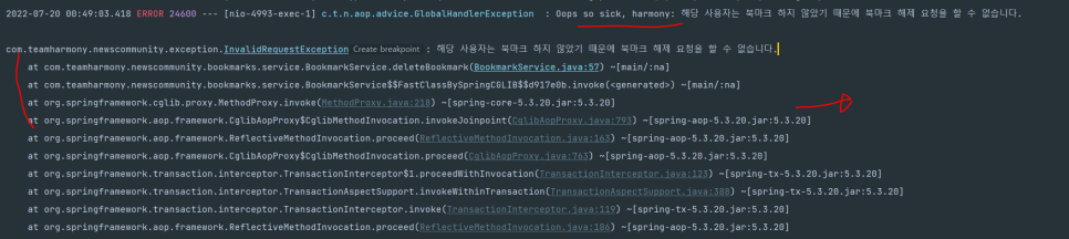 기존에 만들어둔 에러처리에 로깅을 할 수 있게 만들었다. 한장호 튜터님이 에러가 발생한 위치에 log를 찍어주는 방법을 추천해주셨는데, 이 부분이 팀원들이 불편할 거 같아 걱정이 많았다. 근데 우리의 경우 전역적인 에러 처리를 하고 있어 그냥 Exception Hanlder에 stacktrace를 찍어주면 대략적인 에러 위치를 파악할 수 있을 거 같아 일단 해당 방식을 적용해봤다. 뭔가 생각하면서 조금씩 만드는게 너무 재밌다 .. 조금씩 발전해 나가는게 너무 기분이 좋앙 ....