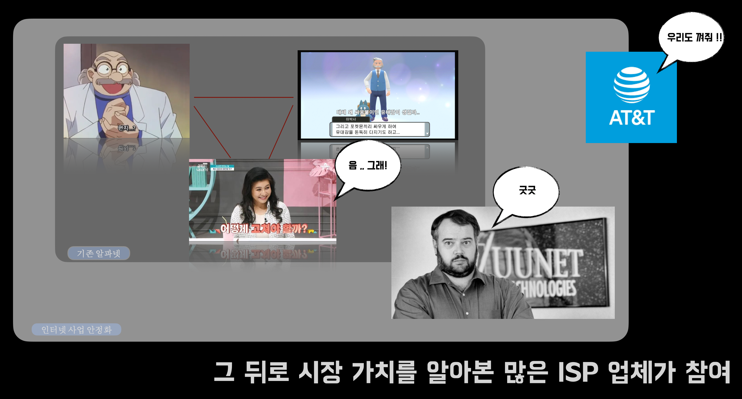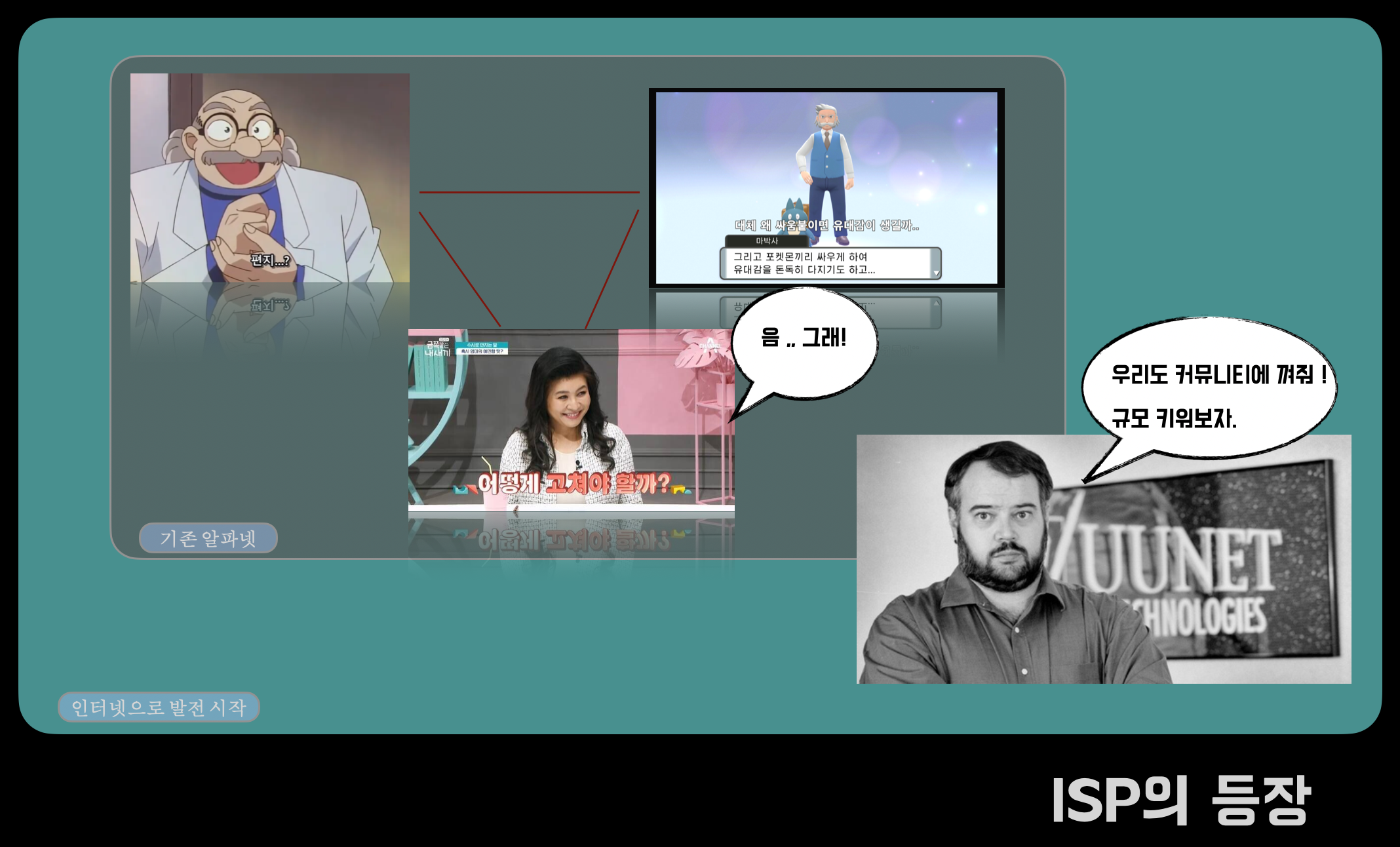기존에 학술 커뮤니티 용도로 사용되던 알파넷은 "TCP/IP 프로토콜 도입", "WWW의 출현", "ISP의 등장"등의 이유로 오늘날의 '인터넷'으로 진화하게 됐다. 여기서 이번 이슈와 관련된 맥락이 등장하는데 바로 ISP. 즉, 인터넷 서비스 제공자라는 것이다. 진화 과정은 아래와 같다.