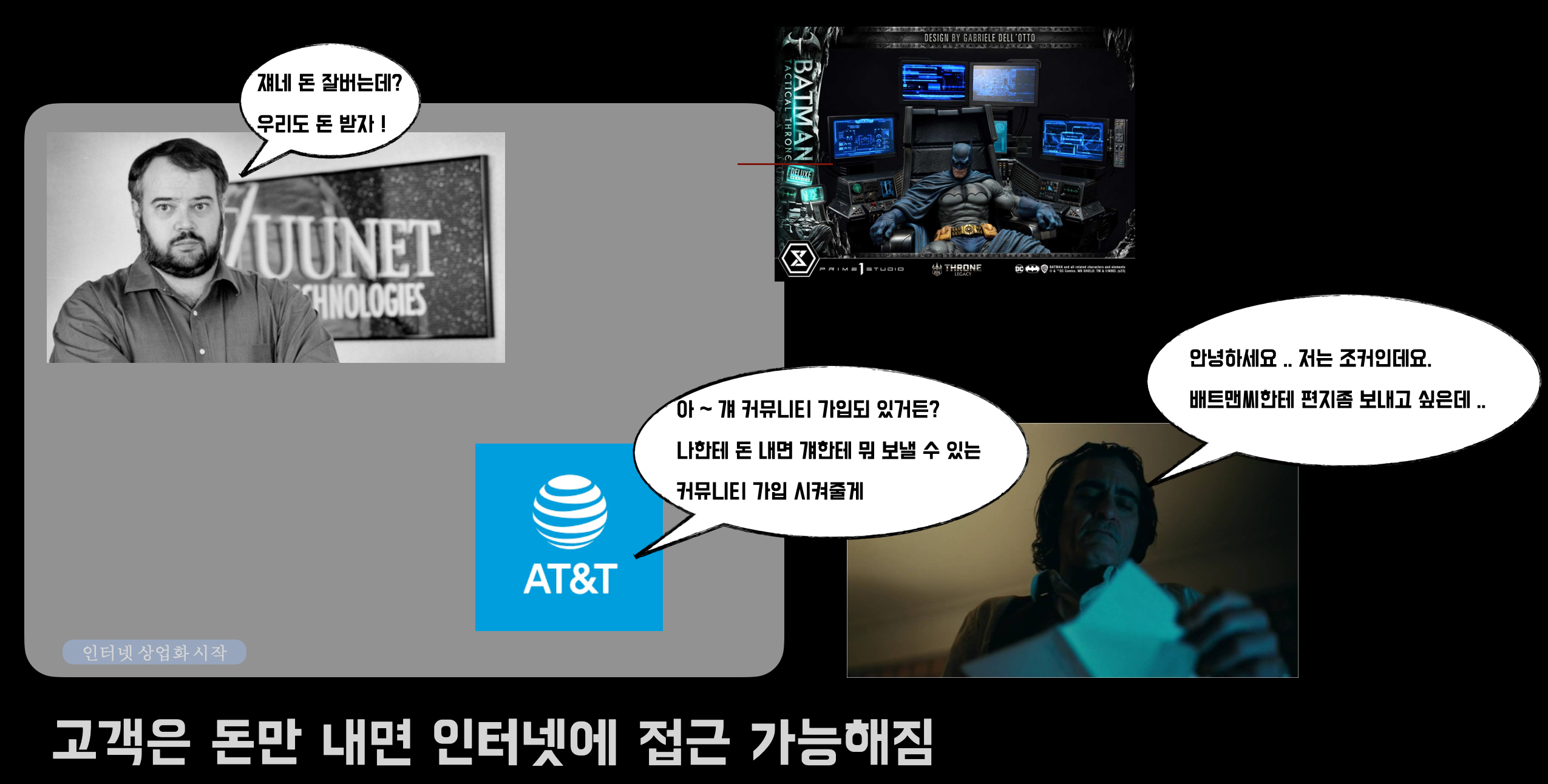 [그림5]. ISP의 등장 배경과 망 가입의 의미 결국 ISP라는 건 멀리 있는 누군가와 정보를 주고받고 싶어서 인터넷이라는 커뮤니티에 접근하고 싶어 하는 사람들에게 돈을 받고 자기가 가지고 있는 노드와 다른 회사의 노드들과 협력해 정보를 대신 주고받는 역할을 하는 사업체를 의미한다. 덕분에 사용자는 복잡한 커뮤니티 가입 절차라던지 내가 원하는 정보를 전달해줄 노드를 관리하지 않고도 인터넷이라는 커뮤니티에 가입한 사람들과 소통할 수 있게 되는 것이다. 이처럼 현재의 인터넷은 알파넷을 거쳐 상업적 목적의 네트워크가 됐다.