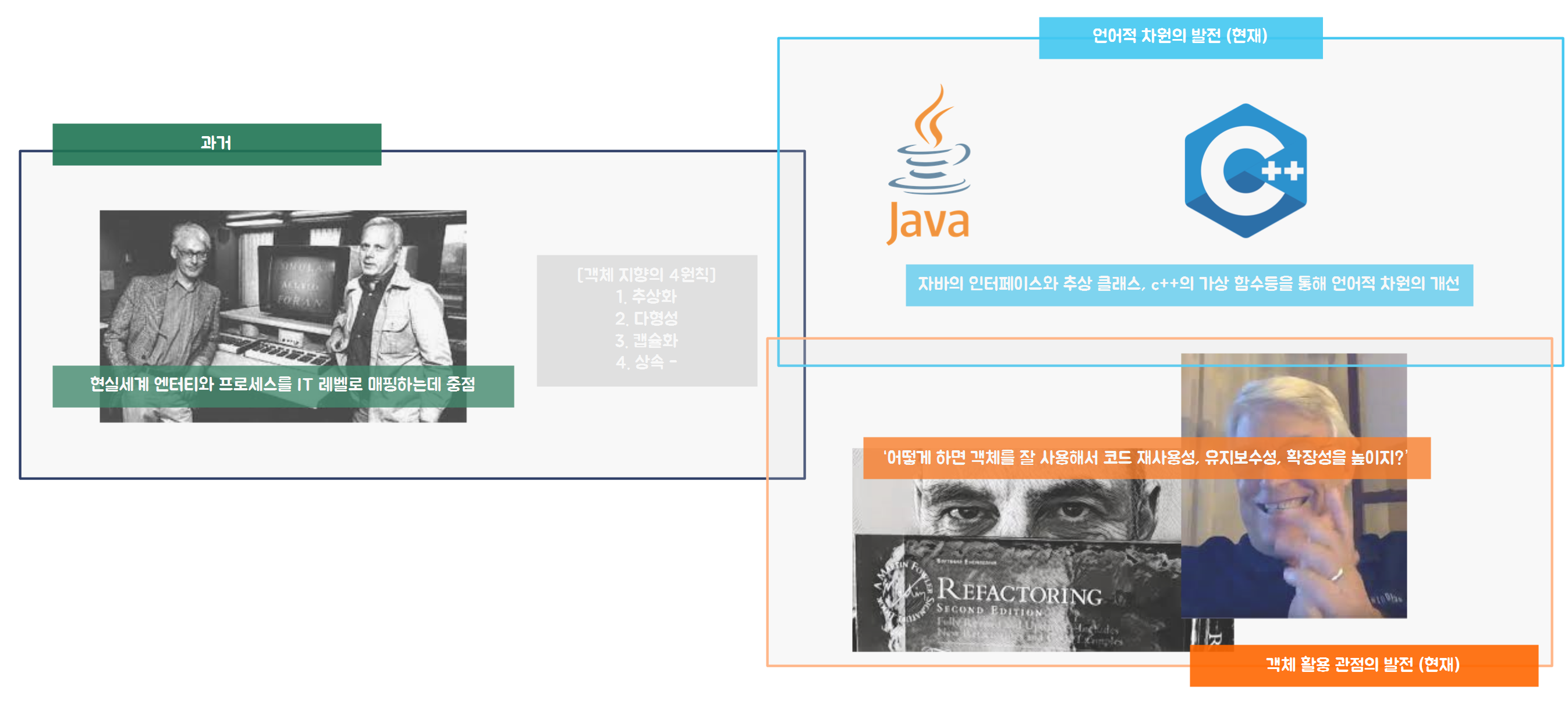 냉수마찰이 현대의 기술 발전을 통해 효과를 입증받고 고도화 되는 것 처럼 객체지향도 그 효과와 가치를 지속적으로 재평가받고 당대 개발자들에 의해 고도화 되어온 것이다. 마틴 파울러, 로버트 C. 마틴 등의 저명한 개발자들은 DI SOLID 같은 개념들을 정립했고 그 결과로 현재 우리가 공부하고 있는 객체지향의 형태가 만들어진 것이다.