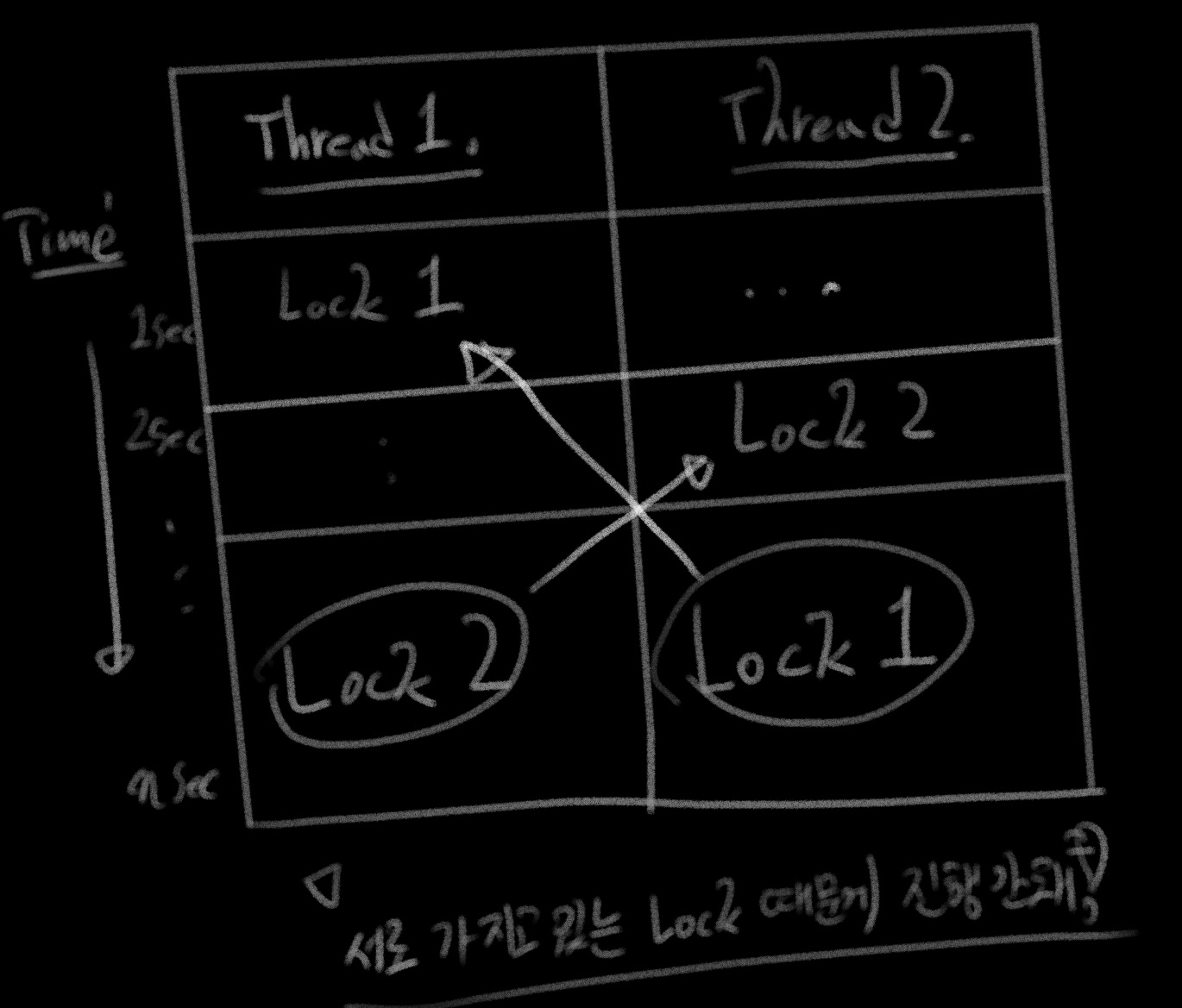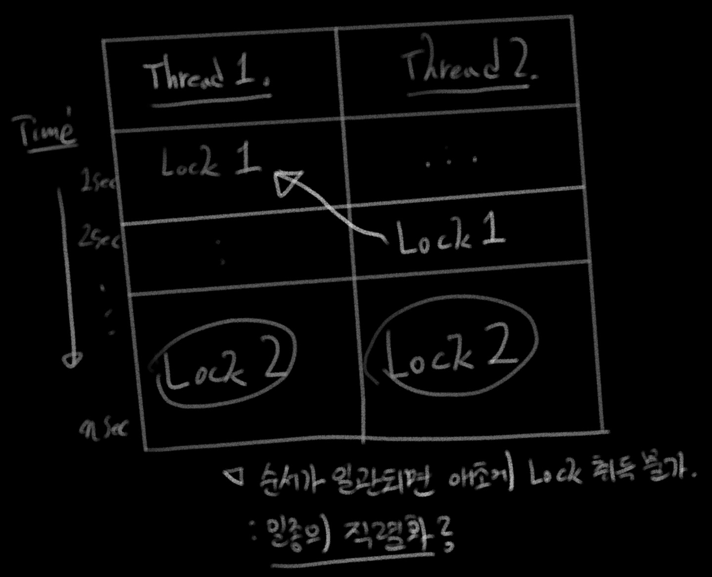 여러 쓰레드를 사용하는 경우 하나의 자원에 동시에 접근하게 하면 여러 문제들이 발생할 수 있는데 이를 해결하는 방법 중엔 "누가 자원 쓰고 있으면 해당 자원에 접근 불가" 토록하는 'LOCK'이란 개념이 있다. 근데 어쩌다 보니까 작업을 완료하는데 서로의 자원이 같은 시점에 필요한 경우가 발생하면 "상대가 먼저 놓기" 전까진 둘 다 작업을 진행 못하는 '교착 상태'가 발생한다.a. 데드락이 먼데[그림2]. 일관적이지 않은 LOCK 순서가 일으키는 데드락 상황 LOCK을 하는 순서가 일관적이지 않을 때